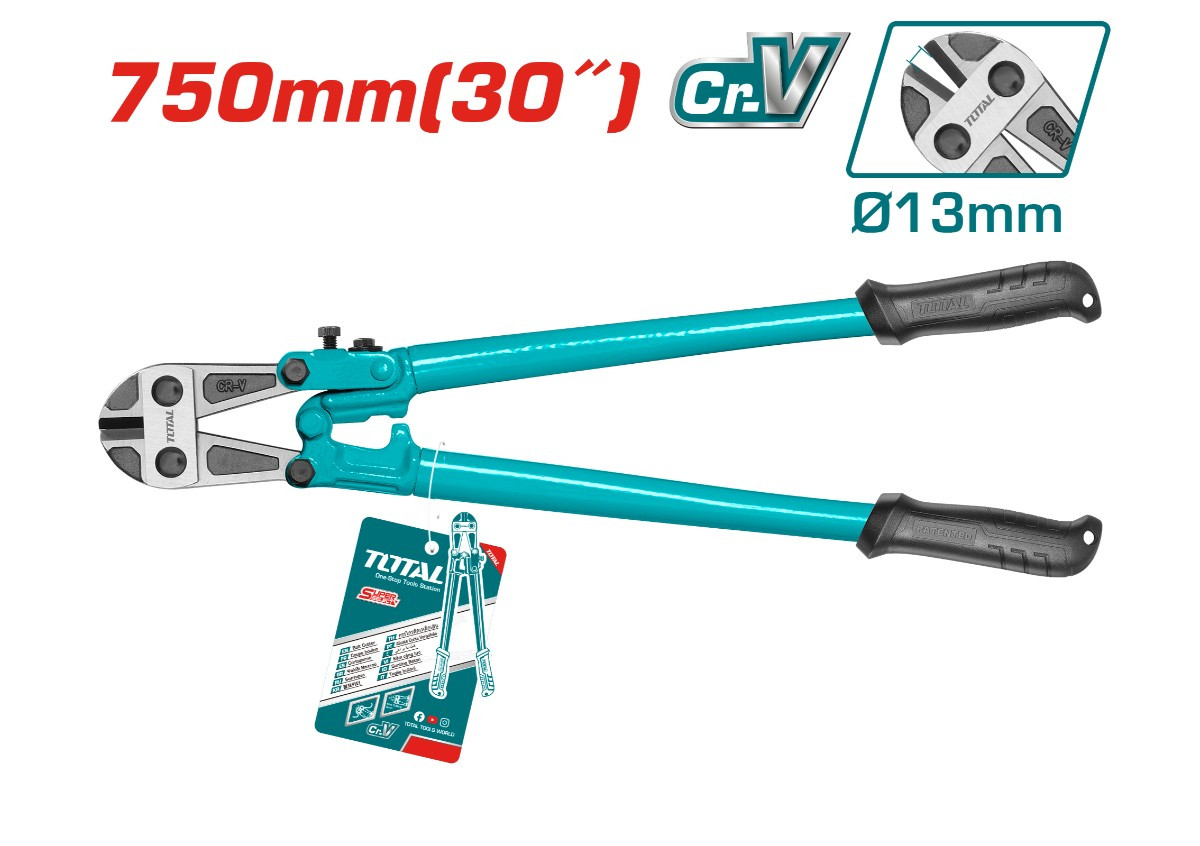 Болторез 750 мм TOTAL THT123306 — ручной инструмент, который используется в промышленности и строительстве для резки проводов, арматуры, болтов. Длина изделия - 750 мм. Конструкция позволяет не прикладывать значительных усилий при работе. Рабочая часть изготовлена из хромванадиевой стали, что обеспечивает ее высокий рабочий ресурс и устойчивость к ржавчине. Для удобства использования болтореза его рукоятки изготовлены из термопластичной резины — этот материал не скользит в руке.