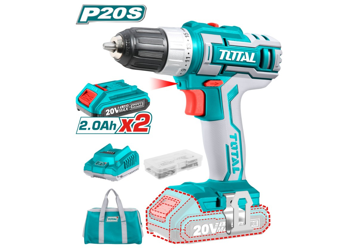 Аккумуляторный шуруповерт 20 В 45 Нм (с 2 аккумуляторами, зарядным устройством, 51 аксессуаром) TDLI2002 TOTAL